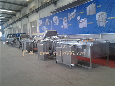 根莖類一條線工藝:分揀輸送機—毛刷清洗去皮機(土豆)另外加一臺毛輥清洗機(胡蘿卜)--提升輸送機—氣泡清洗殺菌機—噴淋清洗機—切菜機—雙層輸送帶—保鮮處理機(土豆)--風(fēng)干瀝水機—包裝輸送線