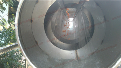 滾筒式清洗機是借圓形滾筒的轉動,使原料在其中不斷的翻轉,同時翻滾的原料與滾筒內壁相互摩擦以及原料之間的相互摩擦,達到清洗的目的,用水管把泥沙由滾筒的網孔經底部排除,該機適合清洗柑橘、橙子、馬鈴薯等質地較硬的物料。動力傳動過程:由電機通過連軸帶動小鏈輪轉動,然后通過鏈條帶動大鏈輪轉動,而大鏈輪與小摩擦輪栽同一根軸上面,大鏈輪的轉動通過連接帶動軸上面的小摩擦輪轉動,然后小摩擦輪帶動大摩擦輪轉動,摩擦輪與滾筒焊接在一起,因此實現滾筒轉動。螺旋導板通過螺旋連接在滾筒內部,當滾筒轉動后,螺旋導板會隨著滾筒一起轉動,里面的螺旋齒在轉動的過程中,會慢慢的把清洗的物料慢慢排除。 帶動大摩擦輪轉動,摩擦輪與滾筒焊接在一起,因此實現滾筒轉動。